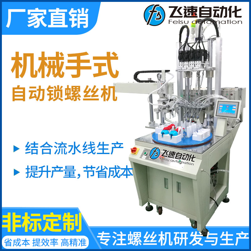 轉(zhuǎn)盤機(jī)械手式擰螺絲機(jī)優(yōu)點: 省人工,流水線專用,配置機(jī)械手和轉(zhuǎn)盤,實現(xiàn)供料、檢測、鎖付、取放產(chǎn)品同步作業(yè),并由設(shè)備自動完成,節(jié)省大量人工;