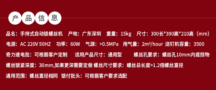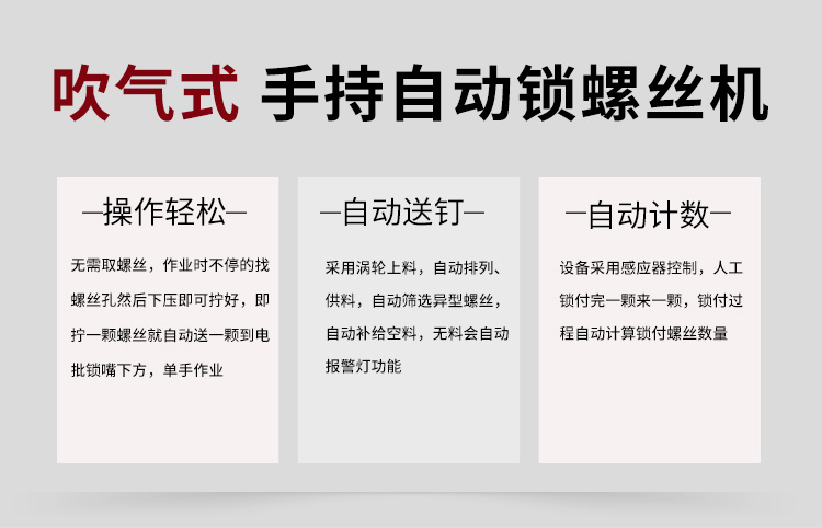 - 產(chǎn)品簡介: 手持式鎖螺絲機(jī)優(yōu)點(diǎn) 省成本:單人即可高效操作,省去一名人工。 提效率:1分鐘可鎖60顆螺絲,效率提高1倍。 更輕松:左手無需取螺絲,可用于扶住產(chǎn)品。 更清潔:不再直接接觸螺絲,避免手部接觸造成二次污染而生銹。 形象佳:智能自動化設(shè)備令企業(yè)生產(chǎn)景象一新,樹立企業(yè)高科技形象。 產(chǎn)品適用范圍 1.適用于各種類型的螺絲,螺絲總長應(yīng)大于1.3倍螺帽直徑; 2.支持深孔螺絲鎖付,孔深小于40mm,M1-M6的螺絲; 3.適用于數(shù)碼、電子、小家電、電源開關(guān)、燈具、LED、玩具等產(chǎn)品。