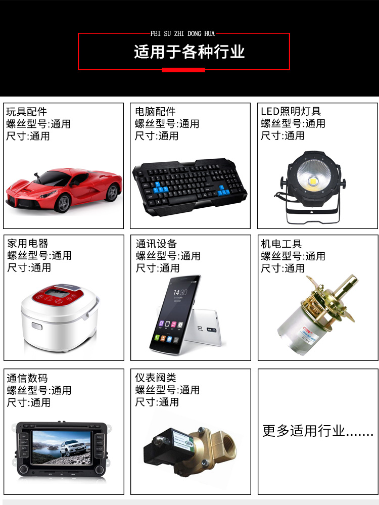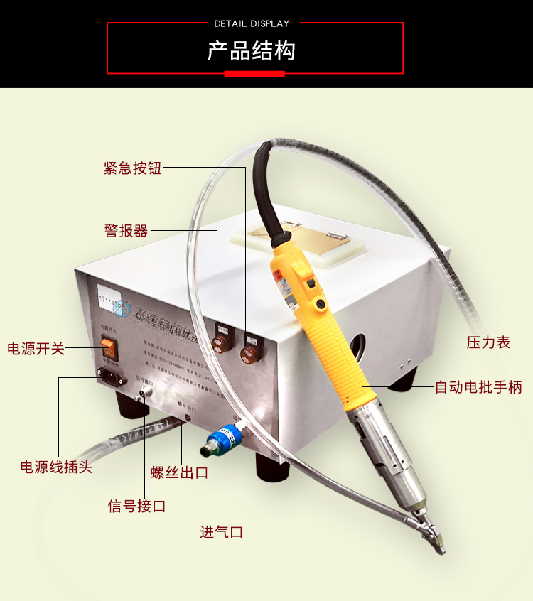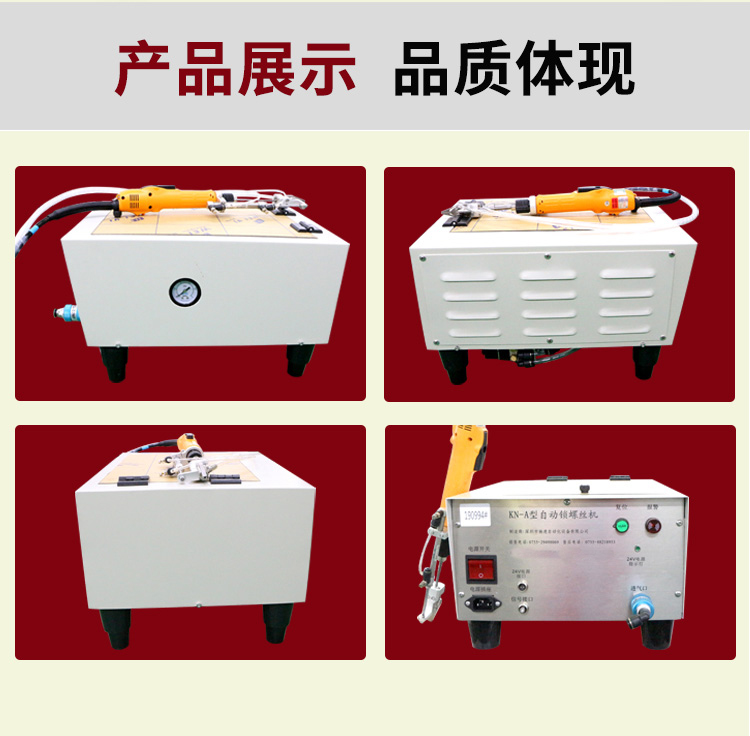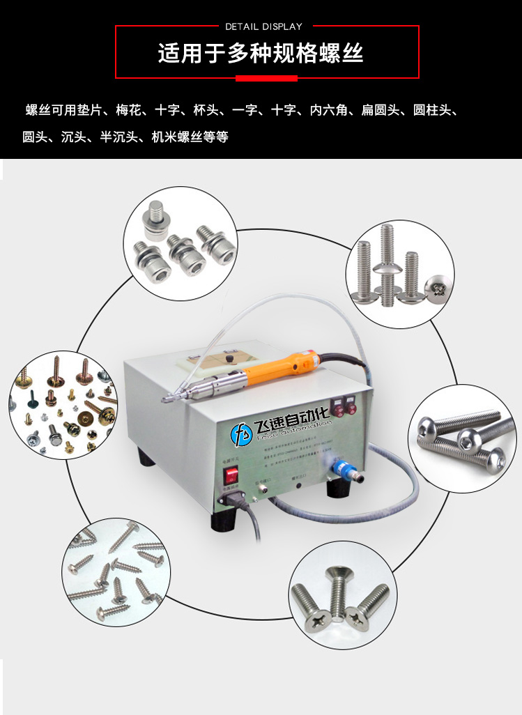 - 產(chǎn)品簡(jiǎn)介: 手持式自動(dòng)打螺絲機(jī)也叫自動(dòng)供料鎖螺絲機(jī)、自動(dòng)擰螺絲機(jī)等,嚴(yán)格來(lái)講,手持式只能算是半自動(dòng),因?yàn)樗€是需要手工操作。一臺(tái)手持式自動(dòng)鎖螺絲機(jī)主要由兩部分組成:自動(dòng)供料機(jī)和電批,其中自動(dòng)供料機(jī)是重要的,也是復(fù)雜的,它的好壞直接關(guān)系到機(jī)器卡不卡料的問(wèn)題。1.采用渦輪上料,體積和噪音小、重量輕,可存放在工作平臺(tái)上,節(jié)省空間; 飛速手持式螺絲機(jī): 1.螺絲自動(dòng)排列、供料,自動(dòng)篩選異型螺絲,自動(dòng)補(bǔ)給空料,無(wú)料會(huì)自動(dòng)報(bào)警; 2.送料采用感應(yīng)器控制,鎖付完一顆來(lái)一顆,自動(dòng)送料,不會(huì)出現(xiàn)重復(fù)給料現(xiàn)象; 3.滑牙不送料:在鎖付工程中,扭力達(dá)不到,螺絲不送出,防止批嘴出現(xiàn)卡料現(xiàn)象; 4.穩(wěn)定性好,不卡料,即使不良導(dǎo)致卡料,非專業(yè)人員也可以在幾秒鐘內(nèi)解決卡料; 5.效率高,一般1秒鐘打一個(gè)螺絲,不用抓起螺絲,只需對(duì)準(zhǔn)螺絲孔位鎖緊螺絲即可; 6.可減少1到2個(gè)工人螺絲鎖付作業(yè),實(shí)現(xiàn)半自動(dòng)化生產(chǎn),降低工人的勞動(dòng)強(qiáng)度,提高生產(chǎn)率; 7.關(guān)鍵部位采用高品質(zhì)五金材料并經(jīng)過(guò)特殊處理,電子原器件采用原裝進(jìn)口,確保設(shè)備零故障。 產(chǎn)品適用范圍 1.適用于各種類型的螺絲,螺絲總長(zhǎng)應(yīng)大于1.3倍螺帽直徑; 2.支持深孔螺絲鎖付,孔深小于40mm,M1-M6的螺絲; 3.適用于數(shù)碼、電子、小家電、電源開(kāi)關(guān)、燈具、LED、玩具等產(chǎn)品。
